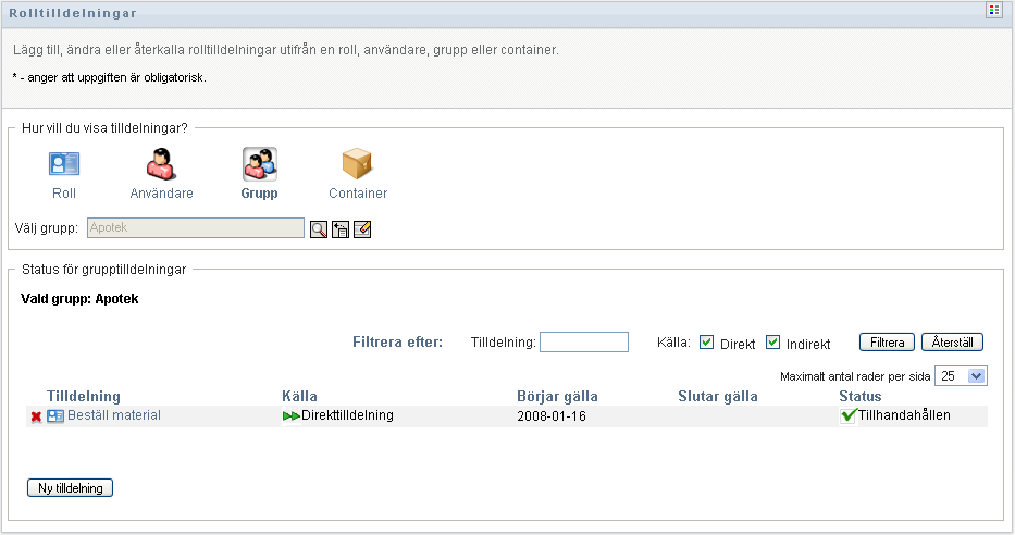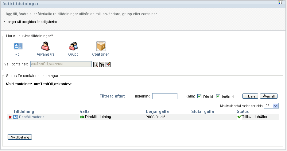Om du endast vill visa tilldelningar som tilldelades indirekt markerar du rutan . Indirekta tilldelningar är tilldelningar som en container får via en rollrelation.