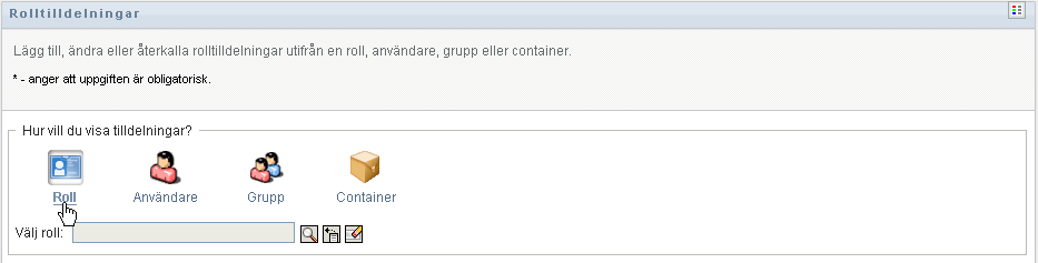 Administratörer för rollmodulen kan begära tilldelning av användare, grupper och containrar till roller. Administratören för rollmodulen har en obegränsad behörighet inom katalogen.