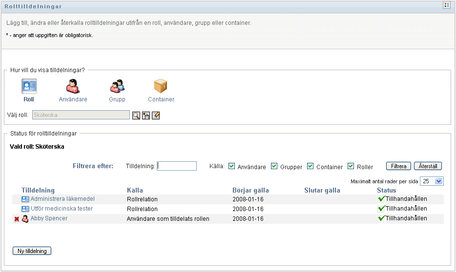 I användarprogrammet visas aktuell status för den markerade rollens tilldelningar.