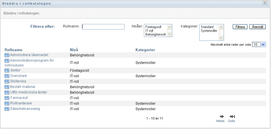 I användarprogrammet visas den aktuella listan med roller i rollkatalogen.