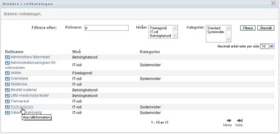 Du kan filtrera listan med roller enligt följande:
