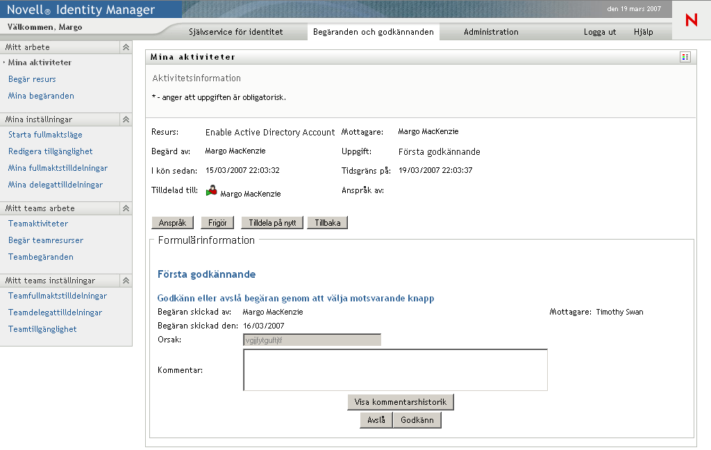 Skaparen av arbetsgången kan inaktivera skapandet av användarkommentarer för en arbetsgång. Mer information finns i Användarprogrammet Identity Manager: Designguide.