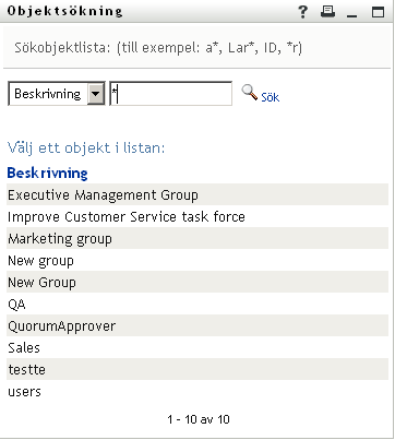 Om rutan är tom klickar du på ikonen så att fönstret Objektsökning öppnas. Ange sökvillkor för gruppmedlemmen, klicka på och markera gruppmedlemmen.
