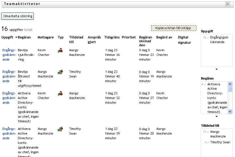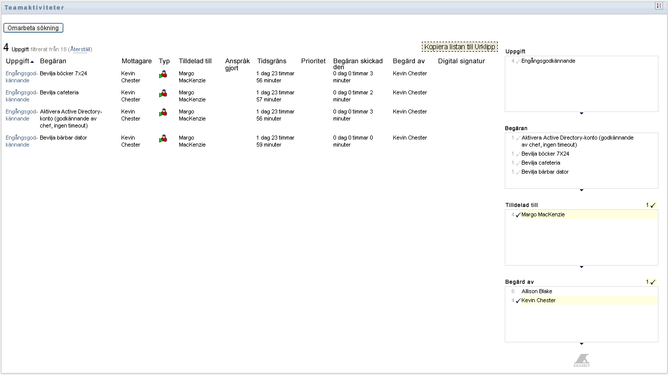 Om du exempelvis klickar på Cecilias namn i filtret Tilldelad till och Kevins namn i filtret Beställd av visas endast aktiviteter som både har tilldelats till Cecilia Claesson och beställts av Kevin Chester, enligt Figur 12-4.
