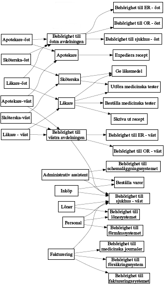 Rollhierarkin har stöd för tre nivåer. Roller som definieras på den högsta nivån (företagsroller) definierar åtgärder som har betydelse inom företaget. Roller på mellannivå (IT-roller) har stöd för teknikfunktioner. Roller som definieras på den lägsta nivån i hierarkin (behörighetsroller) definierar behörigheter på låg nivå. I exemplet nedan visas en rollhierarki med tre nivåer för ett sjukhus. Den högsta nivån för hierarkin visas till vänster och den lägsta nivån visas till höger: