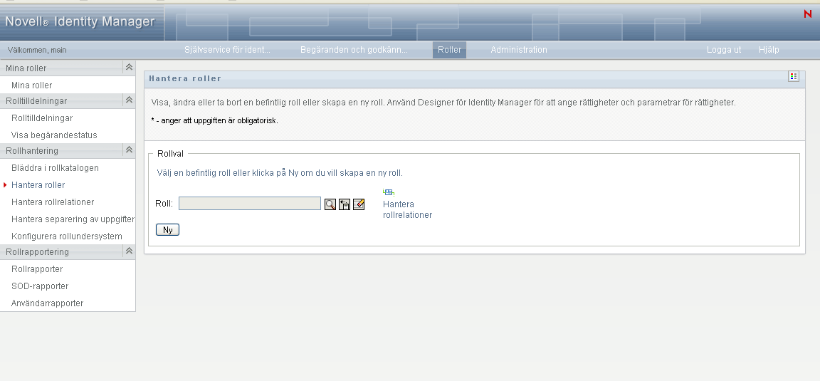 Med åtgärden på fliken i användargränssnittet i Identity Manager kan du skapa en ny roll eller ändra eller ta bort en befintlig roll.