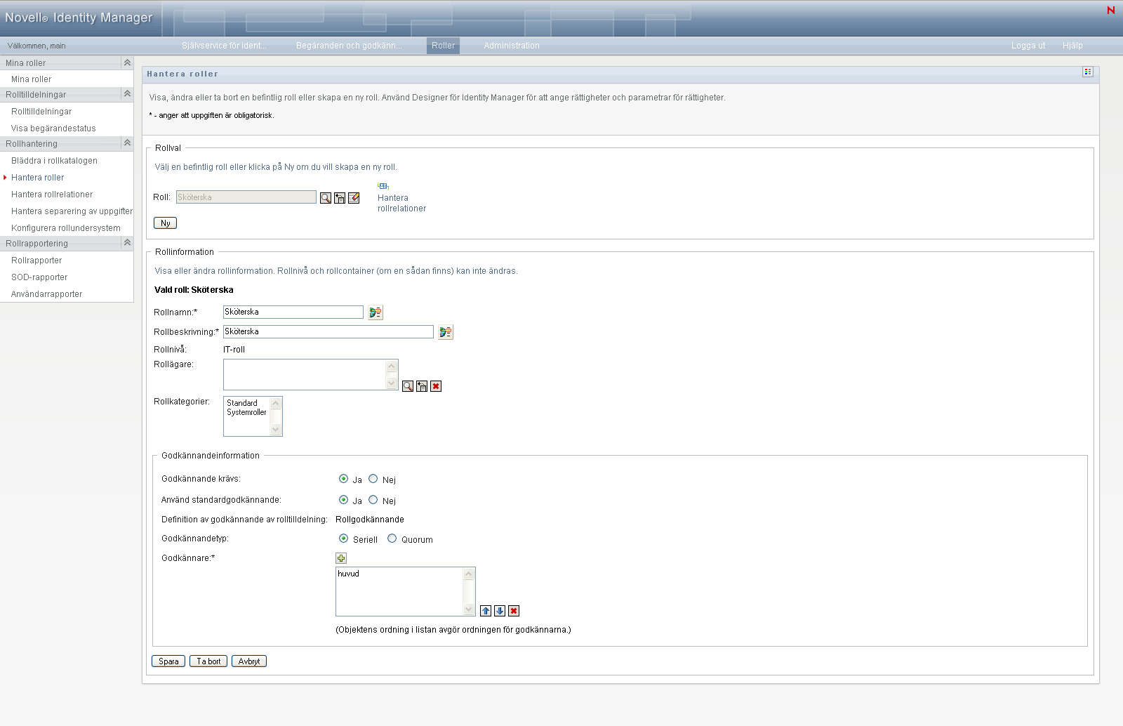 På sidan Hantera roller visas namnet på rollen som har markerats i avsnittet .