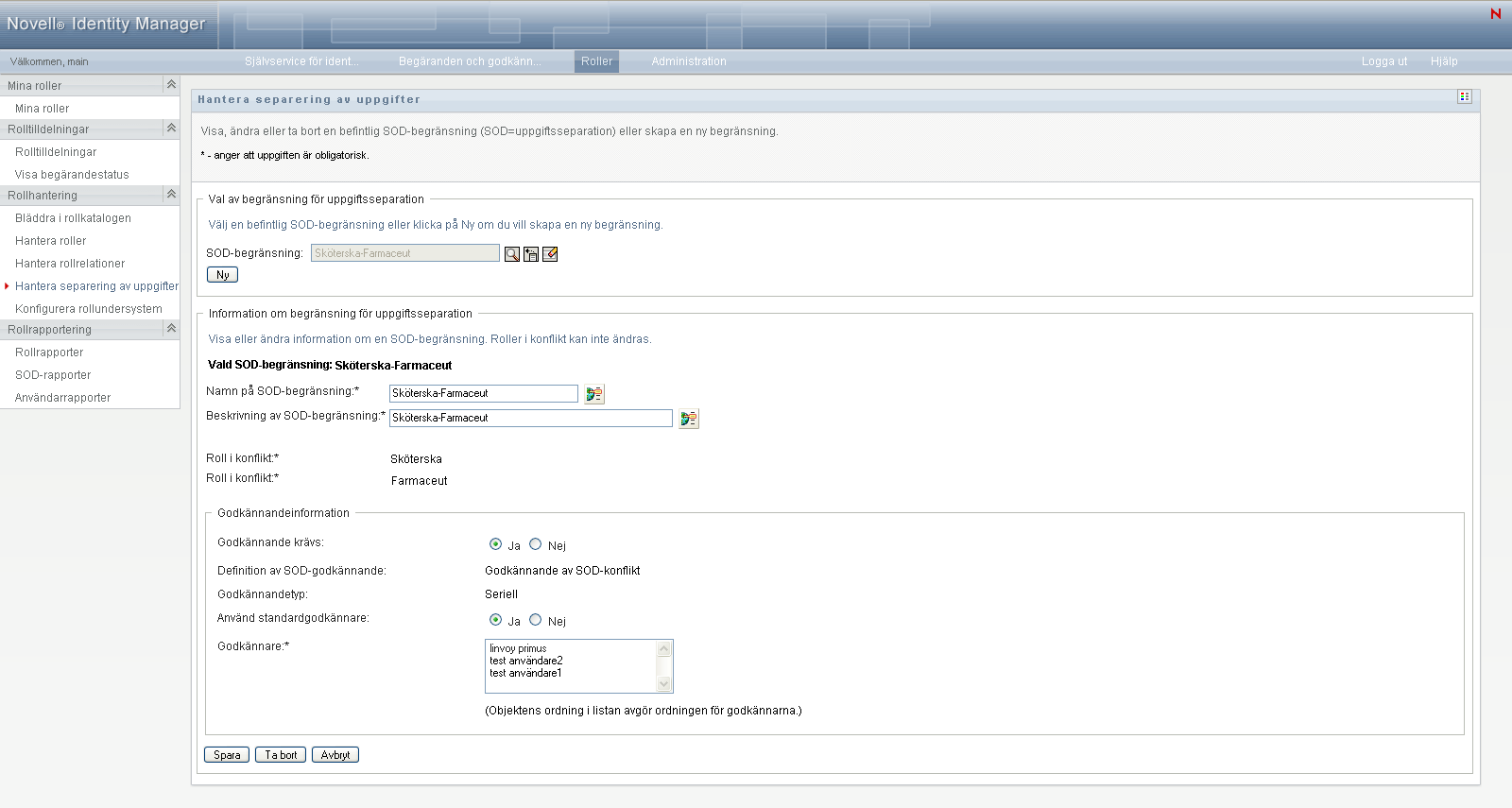 Mer information om hur du fyller i fälten hittar du i Tabell 17-5, Information om SoD-begränsningar och Tabell 17-6, Godkännandeinformation.