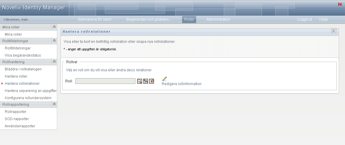 Roller på lägsta nivå (behörighetsroller) kan ingå i roller på högre nivå, men de kan inte innehålla andra roller på lägsta nivå. På sidan Rollrelation kan du endast lägga till en roll på högre nivå.