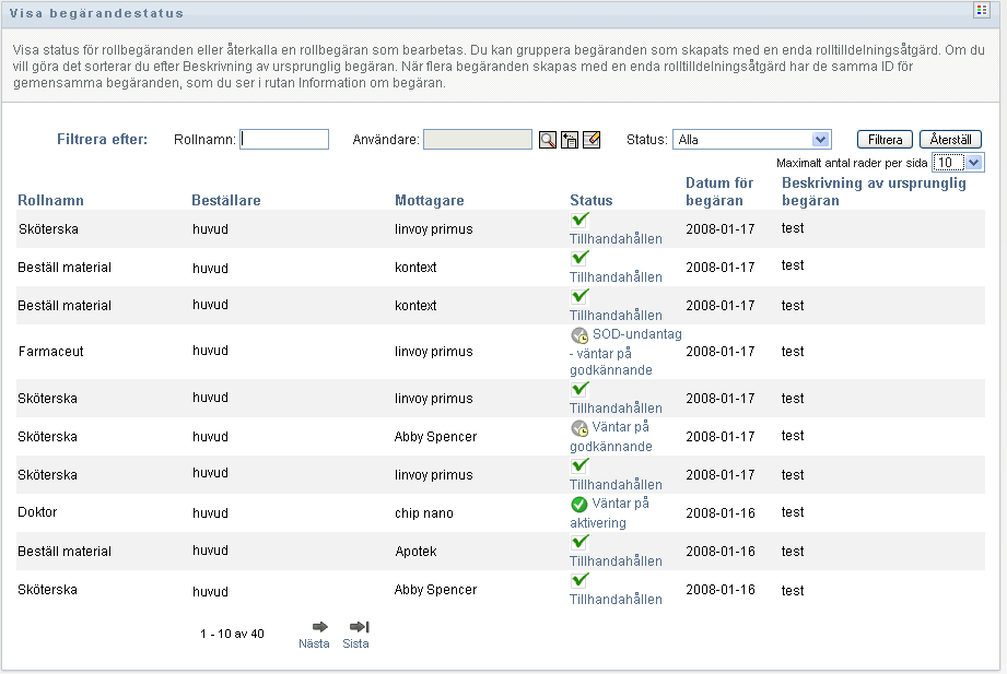 Med kan du visa status för dina rollbeställningar, både beställningar som du har gjort direkt och beställningar om rolltilldelning för grupper och containrar som du tillhör. Du kan visa aktuell status för varje beställning. Dessutom har du möjlighet att återkalla en beställning ännu inte har slutförts eller avbrutits om du har ändrat dig och inte längre behöver få den uppfylld.
