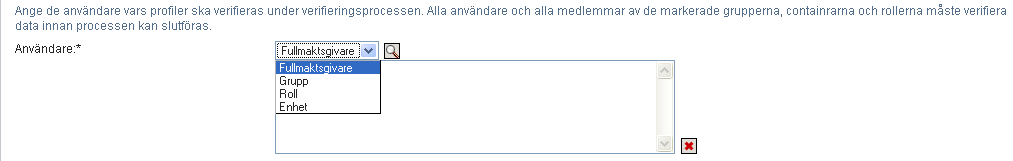 Tänk på att texten i fältet är skrivskyddad. I en verifieringsprocess för användarprofiler är verifierarna de angivna användarna i fältet och alla medlemmar av grupper, roller och containrar som du lagt till i fältet . Detta beror på att varje användare själv måste vara verifierare för sin egen profil.