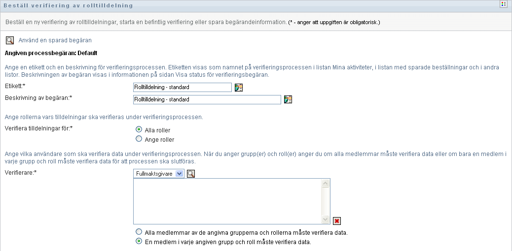 Du måste välja minst en användare, grupp eller roll som verifierare för att starta en verifieringsprocess. Du behöver dock inte välja någon verifierare för att spara en beställning.