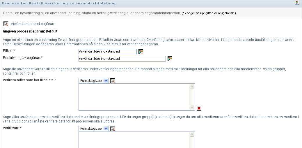 Du måste välja minst en användare, grupp, roll eller container för att starta en verifieringsprocess. Du behöver dock inte välja någon användare, grupp, roll eller container om du bara vill spara en beställning.