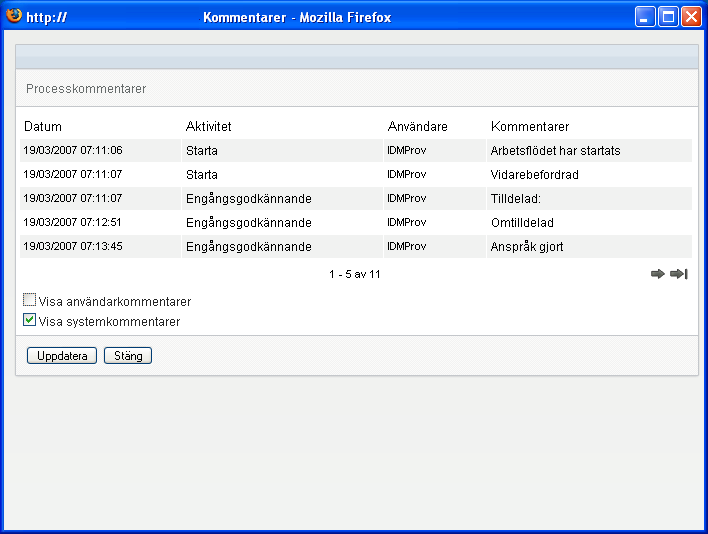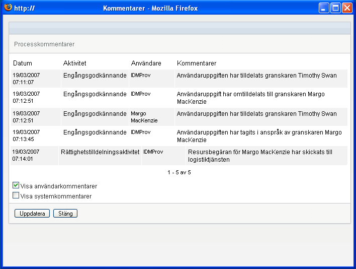 I ett popup-fönster kan du se kommentarer från användare och systemet. Ordningen som kommentarerna visas i avgörs av en tidsstämpel som hör till varje kommentar. Kommentarer visas i den ordning som de anges. Vid parallella godkännandeflöden kan ordningen för aktiviteter som behandlas samtidigt vara oförutsägbar.