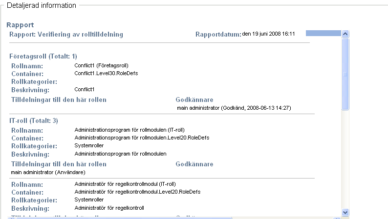Vad gäller rolltilldelning, användartilldelning och verifiering av SoD, innehåller formuläret en rapport som visar de data som du måste granska: