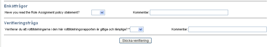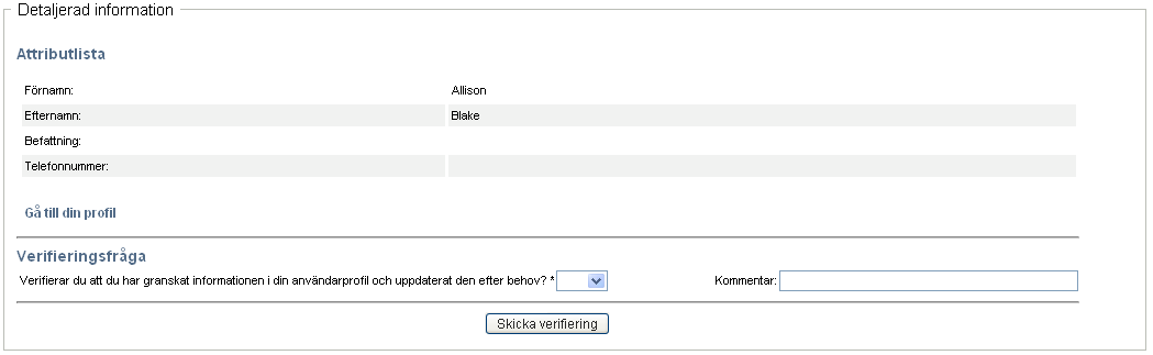 När du tar en aktivitet i anspråk som hör till en verifieringsbeställning måste du granska informationen som visas i verifieringsformuläret. Dessutom måste du svara på den obligatoriska verifieringsfrågan för att bekräfta att data är korrekta, och ibland svara på en eller flera enkätfrågor. Vid verifiering av användarprofiler innehåller formuläret dina användarattributdata som du måste kontrollera riktigheten för. Vad gäller rolltilldelning, användartilldelning och verifiering av SoD, innehåller formuläret en rapport som visar den rolltilldelning, användartilldelning eller SoD-data som du måste granska.