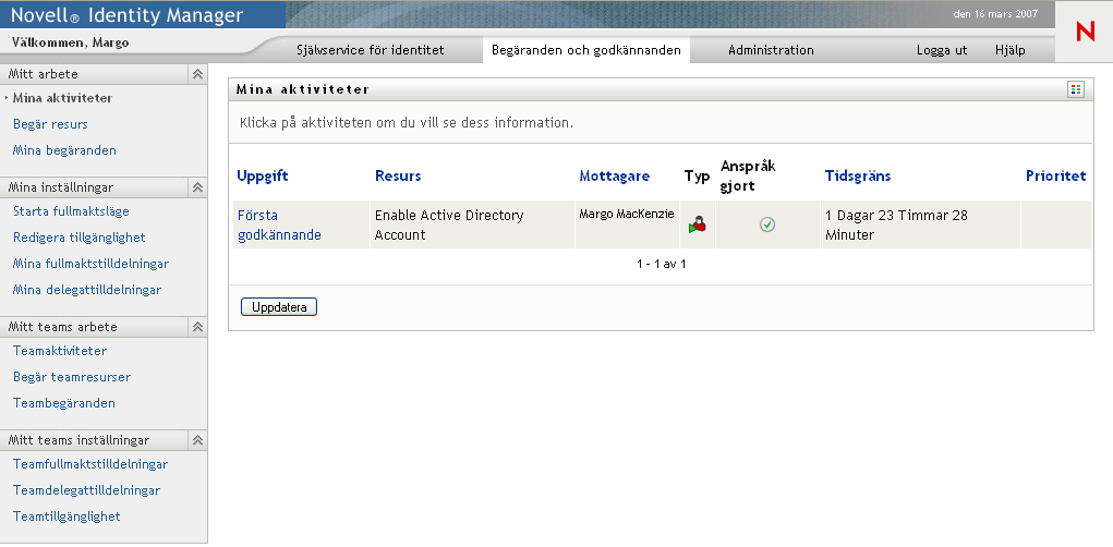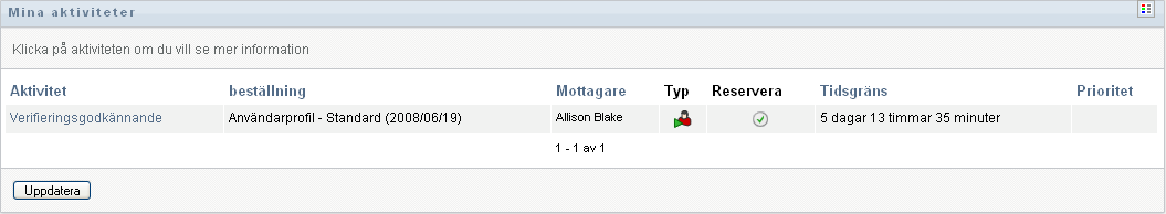 För resurs- och rollbeställningar finns en -kolumn i aktivitetslistan som anger vilka eller vilken användare eller grupp som tar emot resursen eller rollen om beställda godkännanden ges. För verifieringsbeställningar anges namnet på verifieraren i kolumnen , det vill säga namnet på den person som för närvarande är inloggad på användarprogrammet.