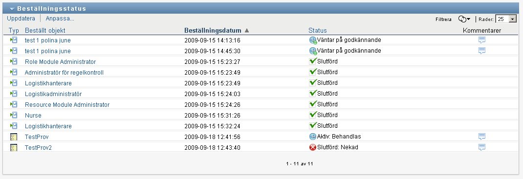 Listan innehåller aktiva beställningar och beställningar som redan har godkänts eller avslagits. Administratören kan ställa in hur länge arbetsgångsresultat ska behållas. Som standard behålls arbetsgångsresultat i systemet Arbetsgång i 120 dagar.