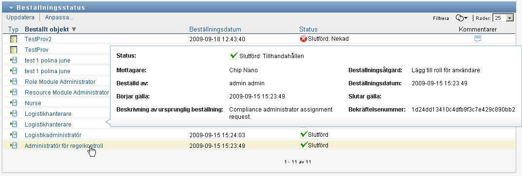 Obs!Om systemklockan på servern med drivrutinen för rolltjänster inte är synkroniserad med systemklockan på servern där användarprogrammet körs kan beställningsstatus visas på olika sätt i listorna Beställningsstatus och Rolltilldelningar. Om du till exempel beställer en rolltilldelning som inte kräver något godkännande kan statusen visas som Tillhandahållen i avsnittet Beställningsstatus medan statusen i avsnittet Rolltilldelningar visar Väntar på aktivering. Efter omkring en minut kan statusen i avsnittet Rolltilldelningar ändras till Tillhandahållen. Du kan säkerställa att statusen visas korrekt i hela användarprogrammet genom att se till att systemklockorna är synkroniserade.