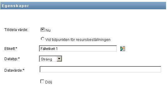Ange en visningsetikett för fältet samt datatyp och värde. Följande datatyper kan användas:
