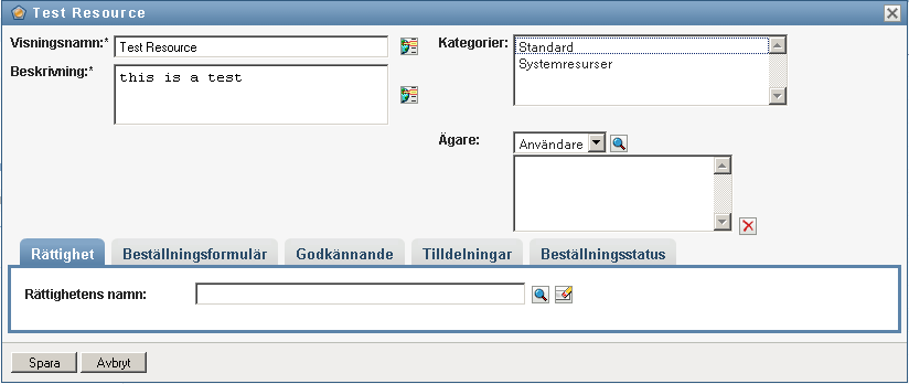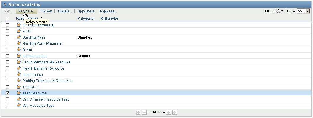 Åtgärden på fliken i Identity Manager gör att du kan visa resurser som har definierats i katalogen tidigare. Det gör också att du kan skapa nya resurser och ändra, ta bort och tilldela befintliga resurser.
