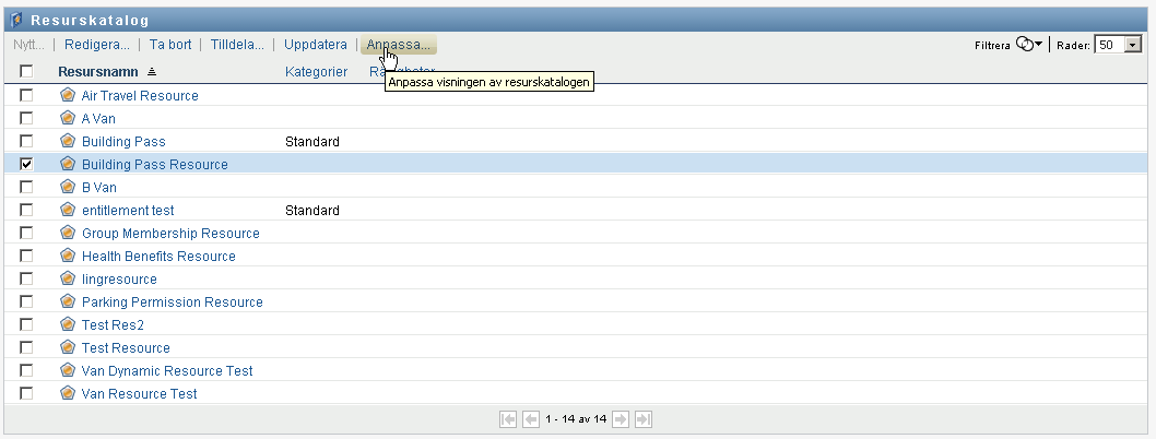 En lista med de resurser som för tillfället är definierade i katalogen visas i användarprogrammet.