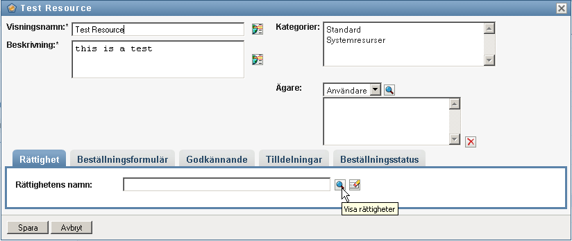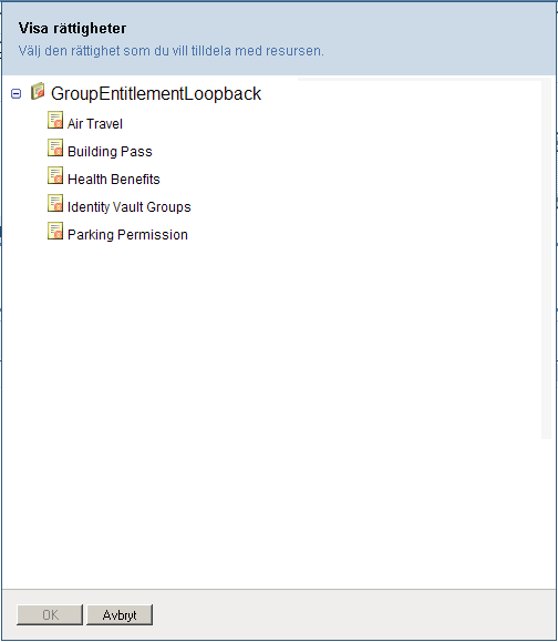 Obs!Om du inte har konfigurerat DirXML-resursen korrekt visas ett meddelande om att du inte har konfigurerat rättigheterna för resursmappning när du öppnar sidan för att välja en rättighet.