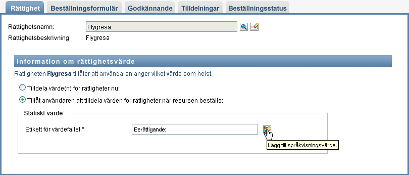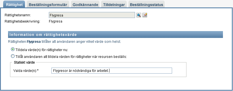 Rättigheten accepterar inga parametervärden. En resurs kan till exempel vara bunden till rättigheten Företagshälsovård som gör att mottagaren kan få tillgång till olika hälsobehandlingar. Den här typen av rättighet har fast funktion och därmed krävs ingen ytterligare information från beställaren. När du anknyter till en rättighet som saknar värde krävs ingen ytterligare konfiguration. |