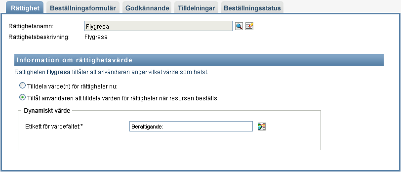 På fliken visas en lista med fält som motsvarar rättighetsparametrar för vilka värden anges vid tidpunkten för beställningen. Egenskaperna för rättighetsparameterfält konfigureras på fliken Åtgärd. Du kan inte ändra funktionen för fält som mappas till rättighetsparametrar.