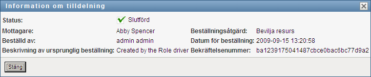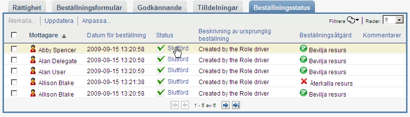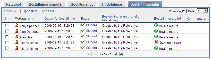 Åtgärden gör att du kan visa status för dina resurstilldelningsbeställningar, inklusive beställningar som du har gjort direkt samt resurser som tilldelats genom roller. Du kan visa aktuell status för varje beställning. Dessutom har du möjlighet att återkalla en beställning ännu inte har slutförts eller avbrutits om du har ändrat dig och inte längre behöver få den uppfylld.