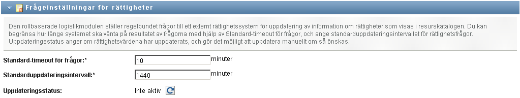 De här inställningarna styr hur rättighetsfrågor från användarprogrammet fungerar. Du kan definiera ett timeoutintervall och en uppdateringsfrekvens för rättighetsfrågor. Dessutom kan du se om rättighetsvärdena har uppdaterats och göra en manuell uppdatering om det behövs.