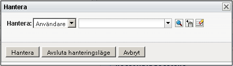 När en domänadministratör eller domänhanterare loggar in i användarprogrammet visas kontrollen som är en global sökkontroll. Kontrollen gör att den nuvarande användaren kan välja en viss användare, grupp, enhet, roll eller gruppmedlem och använda gränssnittet i Instrumentpanelen Arbete för att hantera arbetet för den valda identitetstypen. När användaren har valt en enhet tillhör data och åtkomstbehörigheterna på Instrumentpanelen Arbete den valda enheten, och inte den användare som är inloggad för tillfället. När användaren är i läget Hantera tillhör menyerna och fortfarande den inloggade användaren, inte den valda enheten i kontrollen .