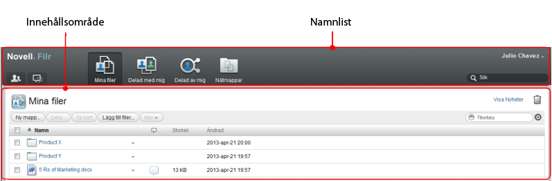 Visar Novell Filr webbapplikation – användarhandbok.