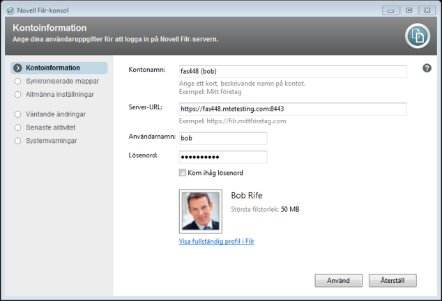 Server-URL: Ange URL för Filr-webbplatsen där du vill synkronisera filer till datorn. Exempel: https://Filr.mittföretag.se.