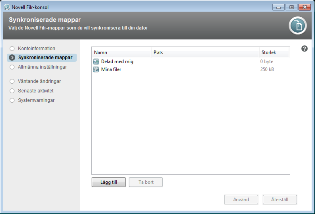 När du först konfigurerar Filr-skrivbordsprogrammet kan du välja vilka mappar du vill synkronisera. Mina filer och Delad med mig synkroniseras som standard. För Nätmappar måste du konfigurera synkronisering manuellt. Du kan konfigurera vilka mappar som ska synkroniseras under den inledande konfigurationen eller när som helst vid ett senare tillfälle.