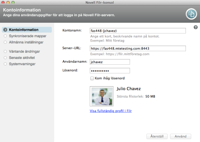 Kontonamn: Ange ett beskrivande namn för Filr-kontot. En mapp med detta namn skapas i användarkatalogen i filsystemet.