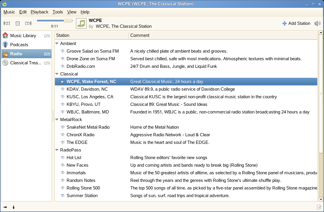 Du kan lyssna på Internetradiostationer och strömmande musik i Helix Banshee. Radiovyn i Helix Banshee visar automatiskt flera vanliga Internetradiostationer som underhålls på banshee-project.org. Du kan även lägga till dina egna stationer.