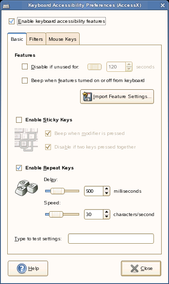 GNOME omfattar tangentbordsinställningar som har utformats för att underlätta för användare med rörelsehinder att använda skrivbordsmiljön GNOME. Här är några av de tillgängliga inställningarna:
