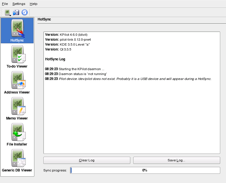 Det är enkelt att synkronisera data från KDE-programmen med data på handdatorn. Starta KPilot och tryck sedan på HotSync-knappen på enheten eller kabeln, så startas synkroniseringen.