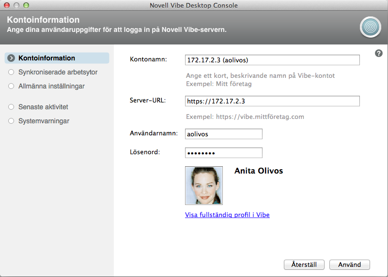 När du konfigurerar Vibe Desktop för första gången anger du uppgifter för kontot och Vibe-servern. Du kan ändra dessa konto- och serveruppgifter när som helst efter den första konfigurationen: