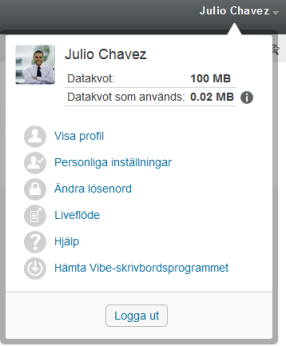 Namnlänk: Klicka på ditt länkade namn i det övre högra hörnet på en Vibe-sida så visas följande alternativ: