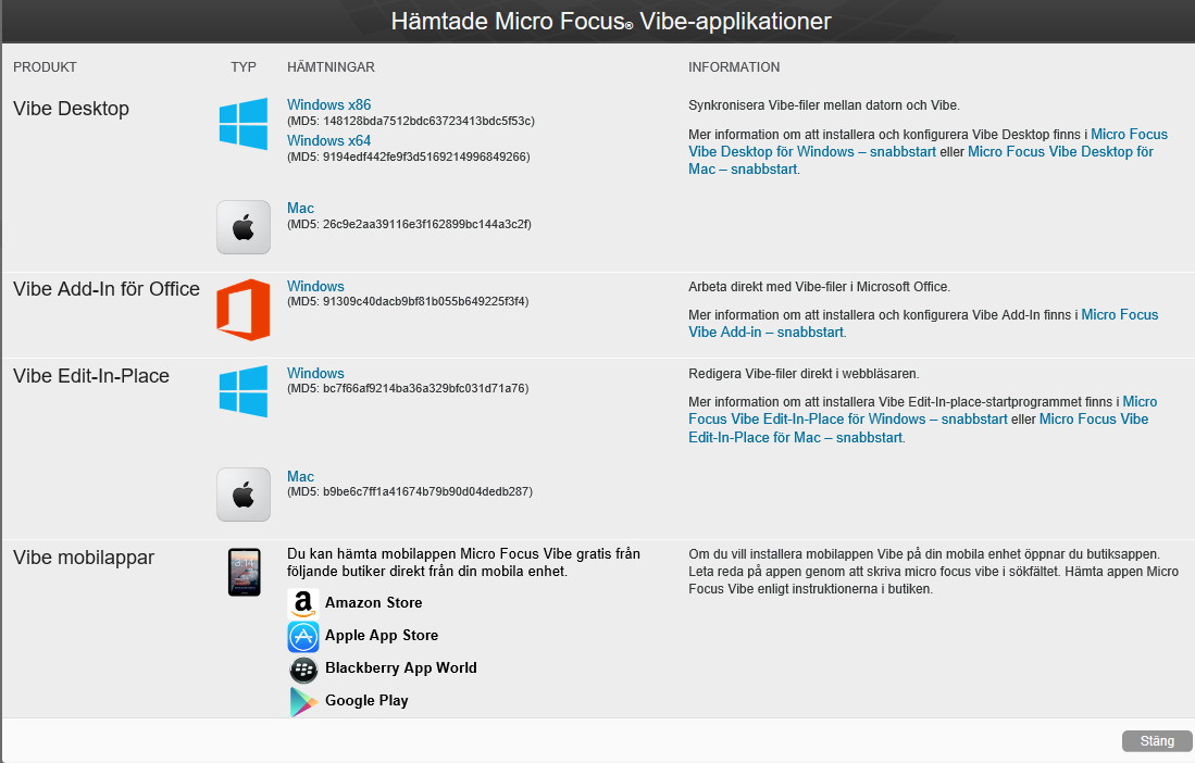 Hämta Vibe Desktop och tillägget från webbklienten: Du kan göra Vibe Desktop och Vibe-tillägget tillgängliga för användare från Vibe-webbklienten.