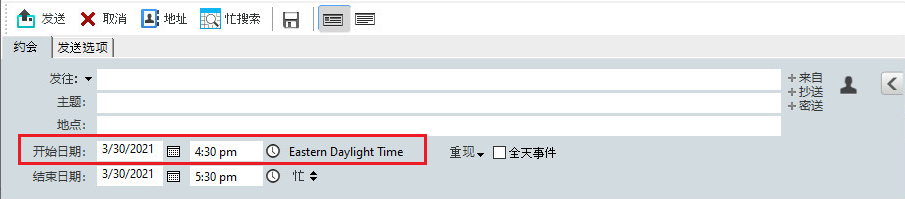 将全天事件发送给收件人时,时间默认会显示为空闲。寄件人可选择让事件在收件人的日历中显示为繁忙,但要想如此显示,必须在每次发送全天事件时都进行设置。