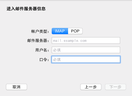 指定 IMAP 服务器。此时您的用户名和口令应该已经填好。