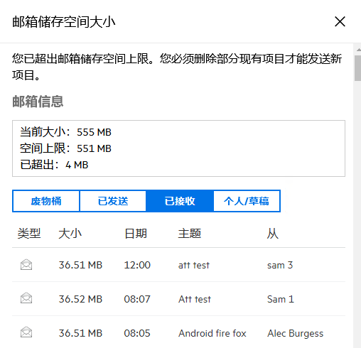 红色 - 邮箱大小已超出储存限制,在您采取措施减小邮箱大小前,将无法发送邮件。