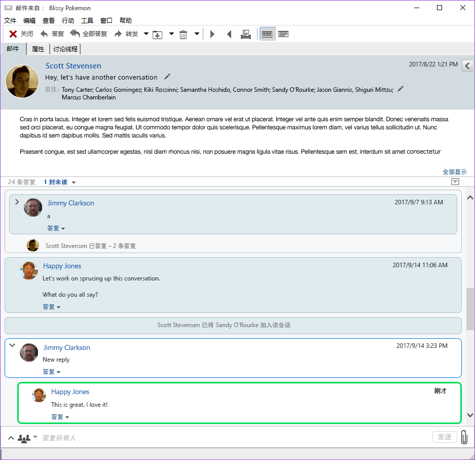 会话中的新答复有一个绿色的边框。当您阅读邮件 3 秒后,它们将不再显示为绿色。您可以单击“项目列表”中某个项目旁的绿色未读数,清除该项目的未读项目。