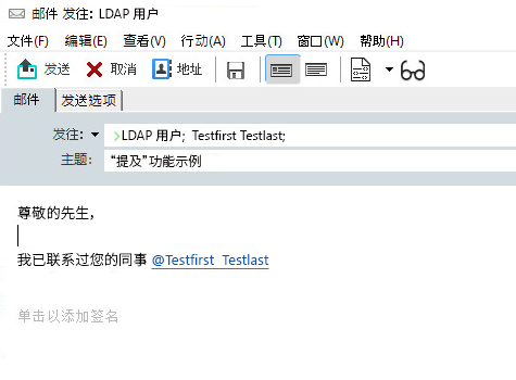 利用提及功能,您可以在发送项目的讯息正文中使用通讯录名称补全功能,快速将收件人添加到发往字段中,同时又能通过插入到讯息中且以链接和强调格式显示的名称,来直接在讯息正文中引起这些收件人的注意。