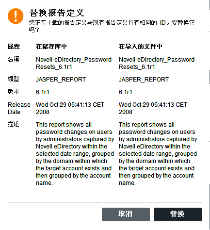 如果报告库中已经存在相同的报告(基于报告的唯一 ID),Identity Audit 将显示系统中的和正在导入的两个报告的详细信息。用户可以决定是否替换现有报告。在下面的情况下,导入的报告与现有报告版本相同。