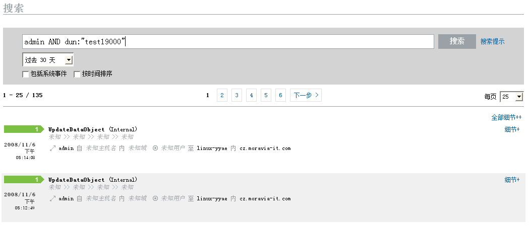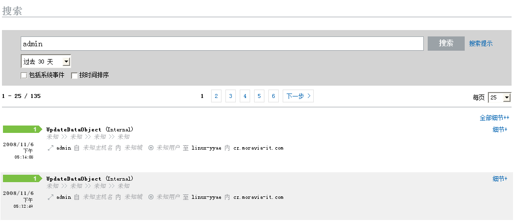 用户可以单击页面右侧的“详细信息”链接以查看任何事件的更多详细信息。使用“所有详细信息++”或“所有详细信息--”链接可以展开或折叠页面上所有事件的详细信息。当您查看多个结果页面或执行新搜索时,此选择将保留。