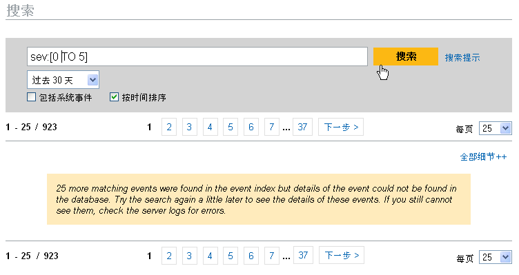 搜索引擎有时对事件编制索引可能会比将其插入到数据库中要快。如果用户运行的搜索返回未插入到数据库中的事件,用户则会收到一则信息,指出某些事件与搜索查询匹配,但在数据库中找不到该事件。一般来说,如果稍后再次运行该搜索,事件则会位于数据库中,搜索也会成功。
